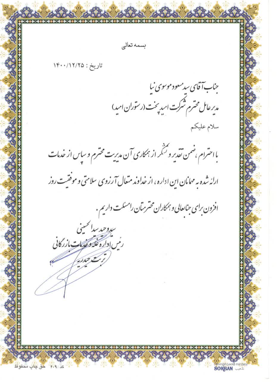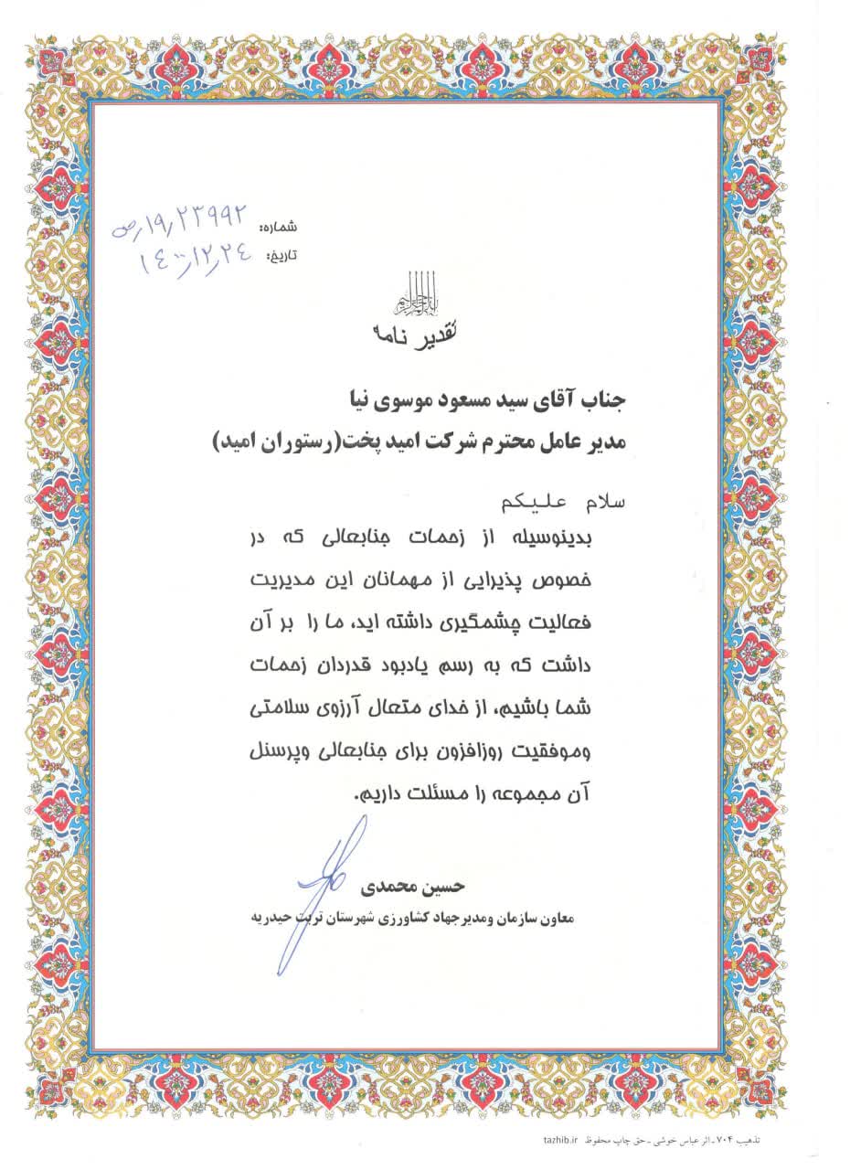 فضای گرم و ارامشبخش رستوران امید،محیطی ایده ال برای یک تجربه غذایی لذتبخش است.چه برای قرار دوستانه و چه برای یک دورهمی خانوداگی،ما لحظات خوشی را برای شما رقم میزنیم.